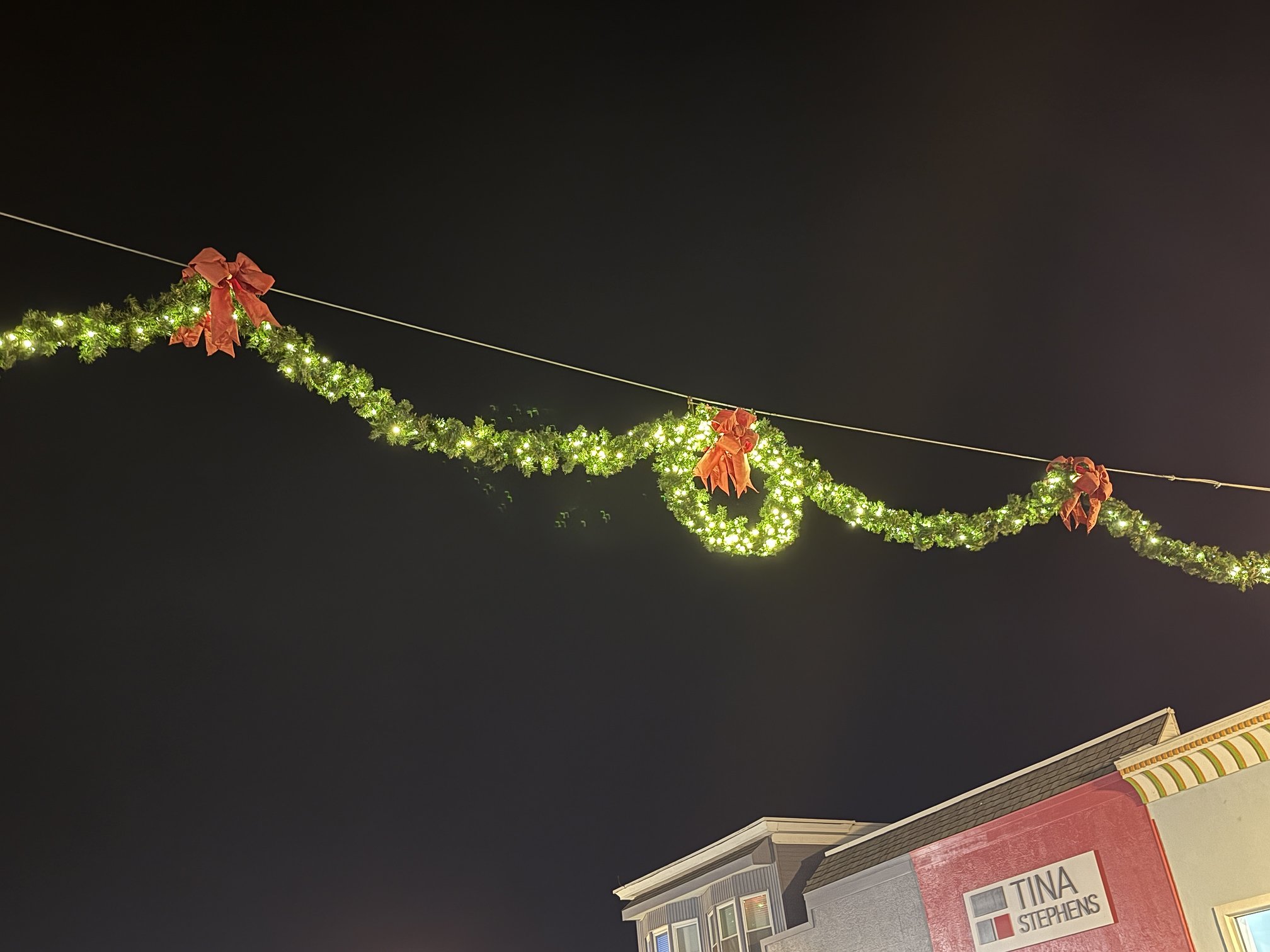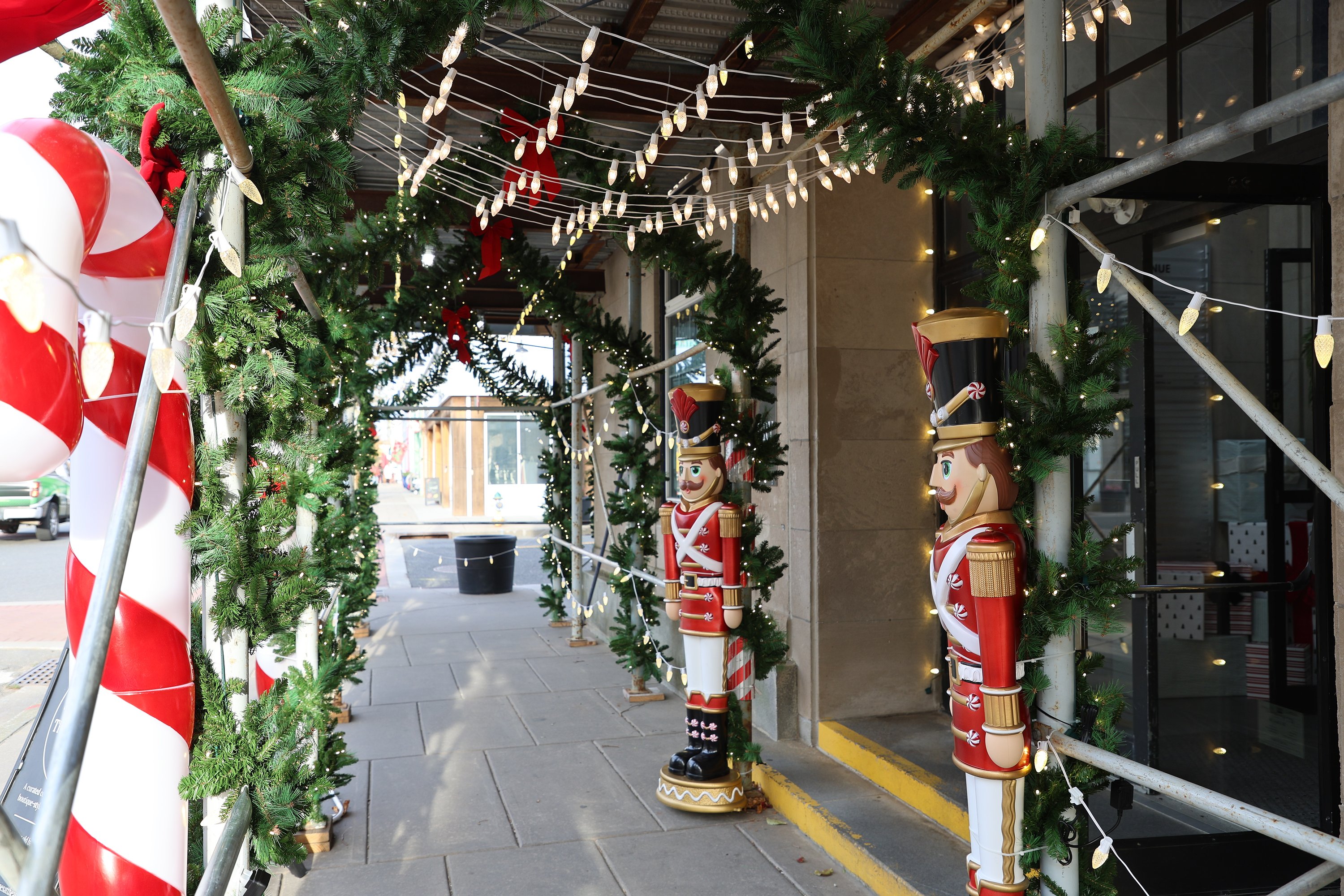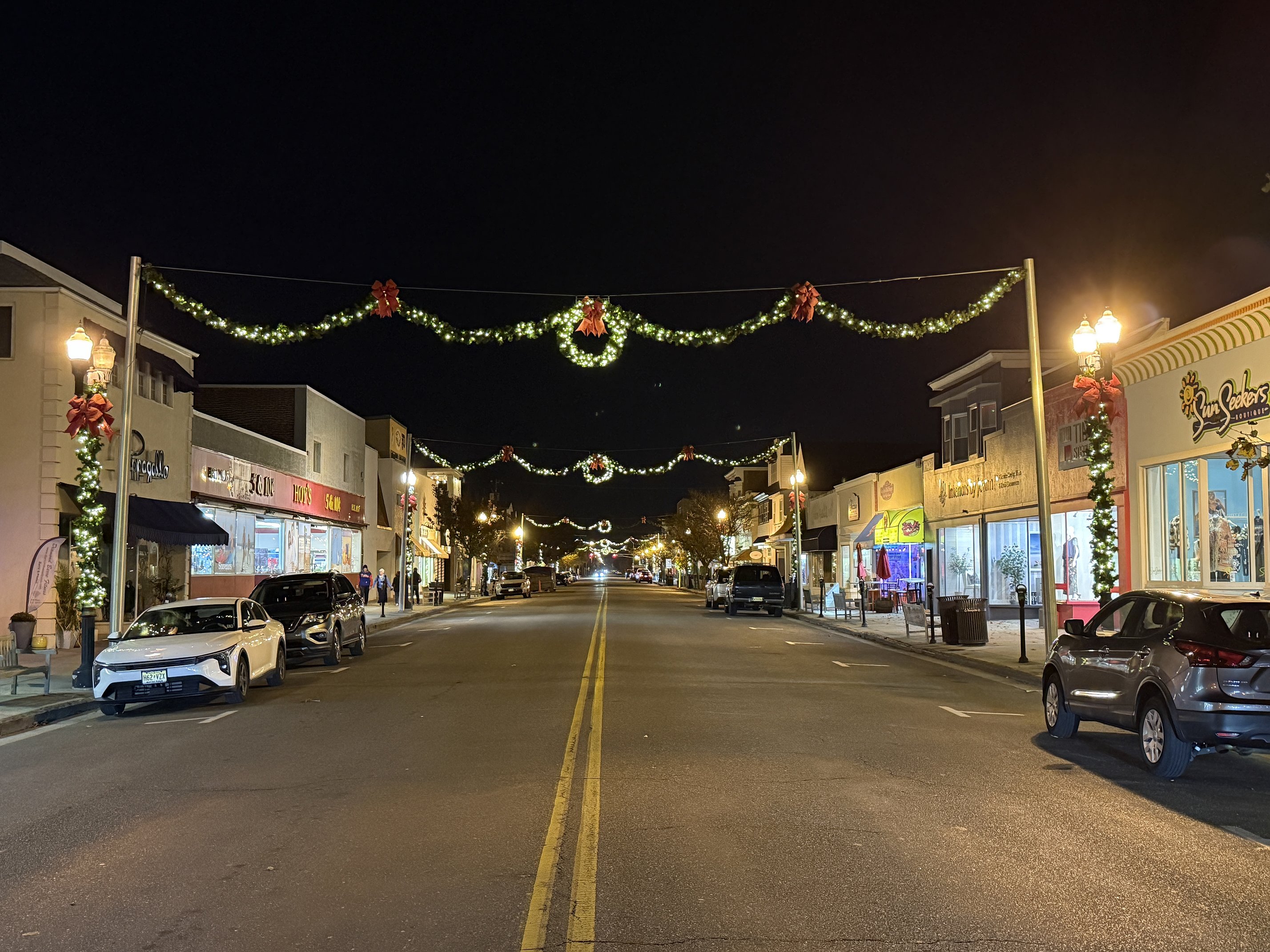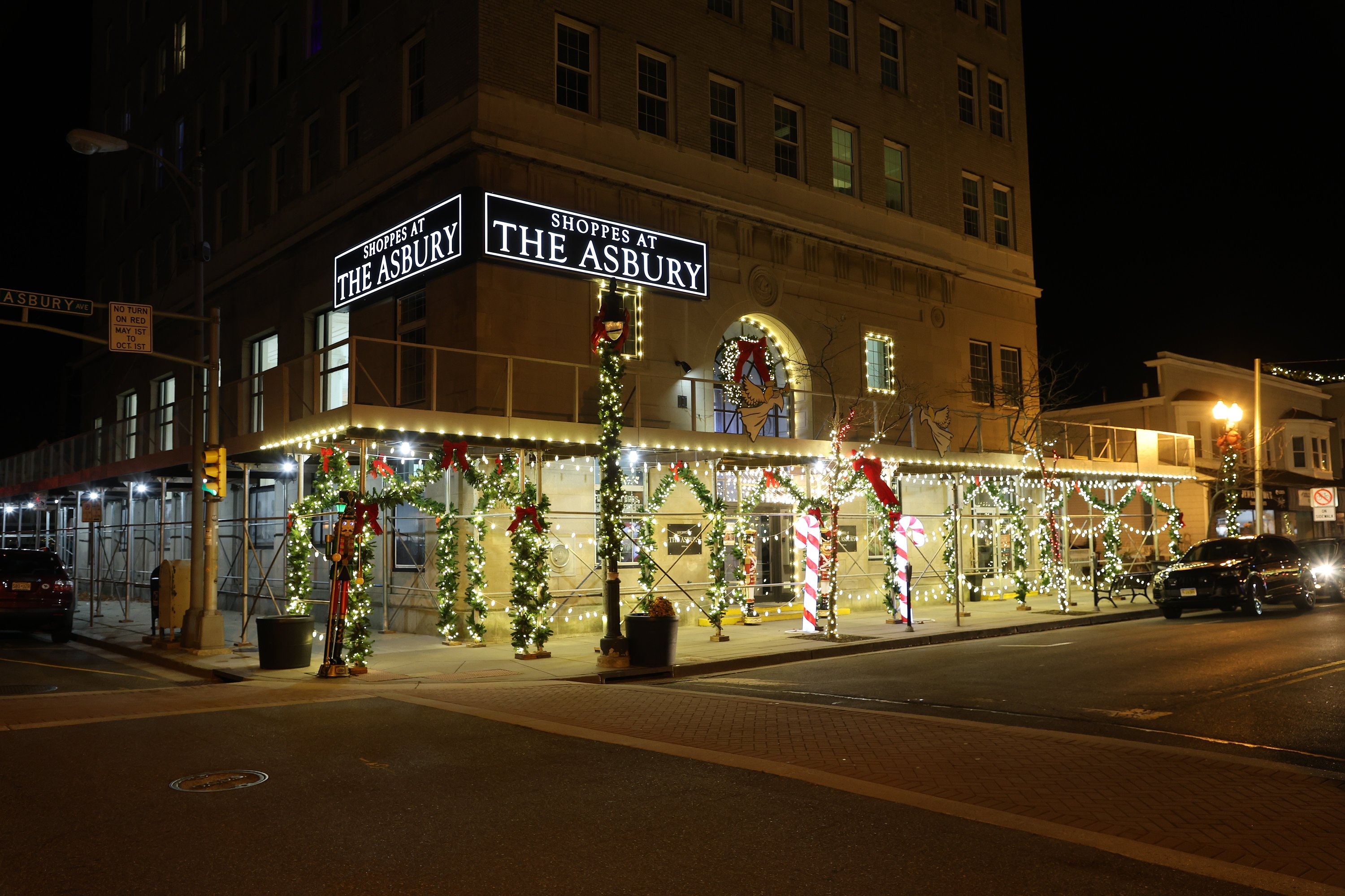 Holiday decorations line Asbury Avenue from 6th through 14th streets, where light posts are wrapped with sparkling garland and bright red bows. Pine-green wreaths and garland hang gracefully over the street throughout the stretch.