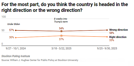 Most New Jersey voters, or 58 percent, think the country is headed in the wrong direction, while one-third think it is on the right track. These rates mirror what a Stockton poll found this time last year, although partisan sentiment has flipped.