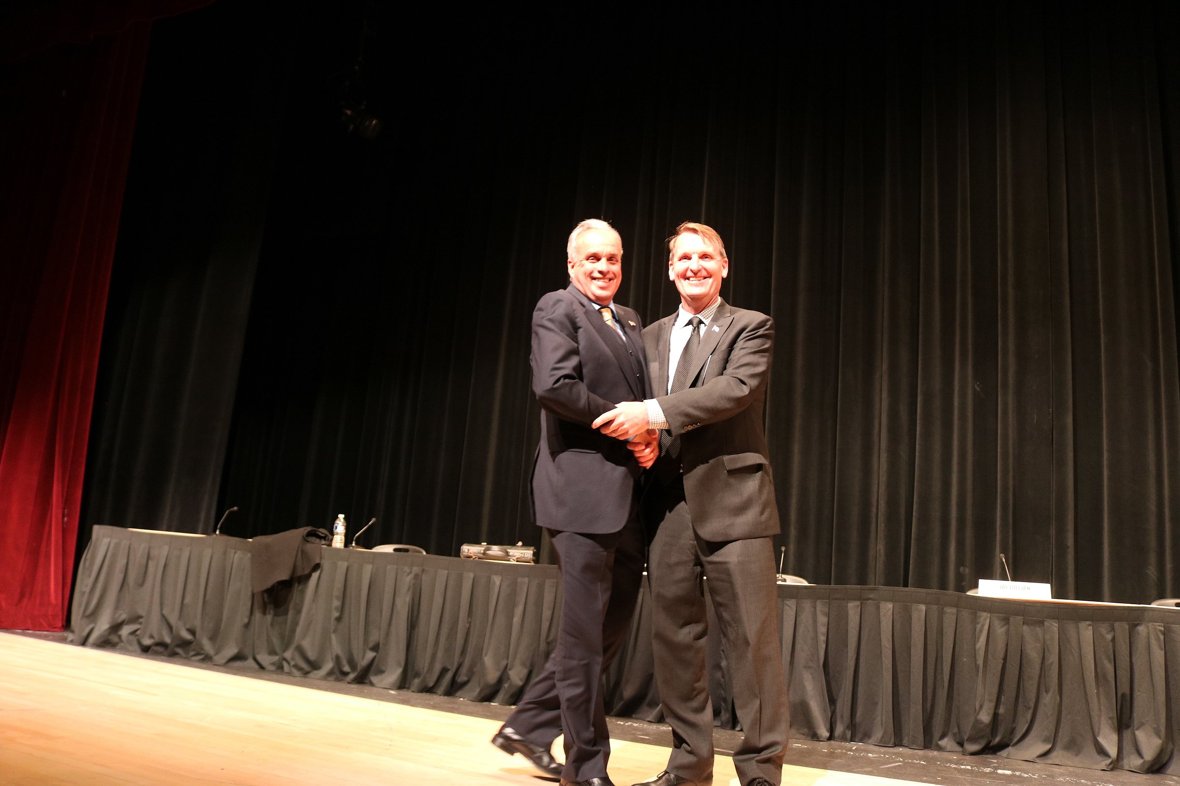 Keith Hartzell, left, and Mayor Jay Gillian shake hands after the candidates' forum during the 2022 election.
